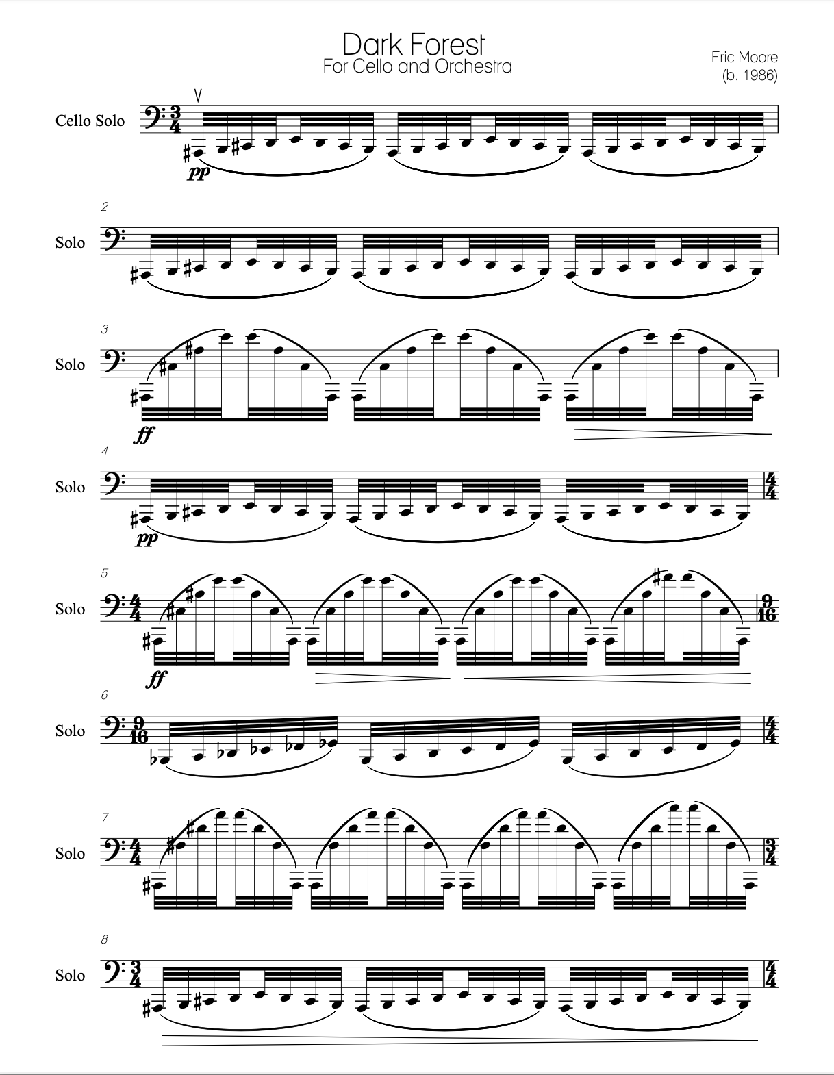 I think I know where it should head from here and I’m planning to take inspiration from Nicholas Deyoe’s Still Getting Rid Of (Audio of premiere) which we premiered with La Jolla Symphony in, gosh, 2011… and also from the last section of Michael Gordon’s Industry (YT, Ashley Bathgate). I may use increasingly high harmonics on A and D for the chords’ pitch content (but played in their more piercing range close to the top of the string instead of their mirror image, nicer-sounding range at the bottom of the string), or I may use those opening chords like I mentioned.